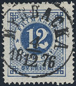 Sweden. Facit 21o used, 12 öre ultramarinish deep blue, distinct print. Superb cancellation MYRBACKA 4.12.1876. Signed by O.P.