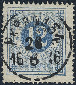 Sweden. Facit 21p used, 12 öre dull blue-light blue. Superb cancellation PKXP Nr 34 28.8.1876. Slightly short perf.