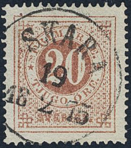 Sweden. Facit 22e used, 20 öre brownish red. Superb cancellation SKARA 19.2.1875.