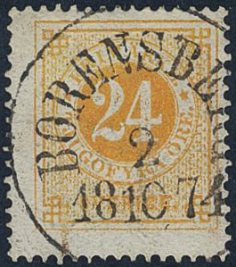Sweden. Facit 24d used, 24 öre yellow-orange on ordinary paper. Superb cancellation BORENSBERG 2.10.1874. Slightly short perf.