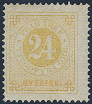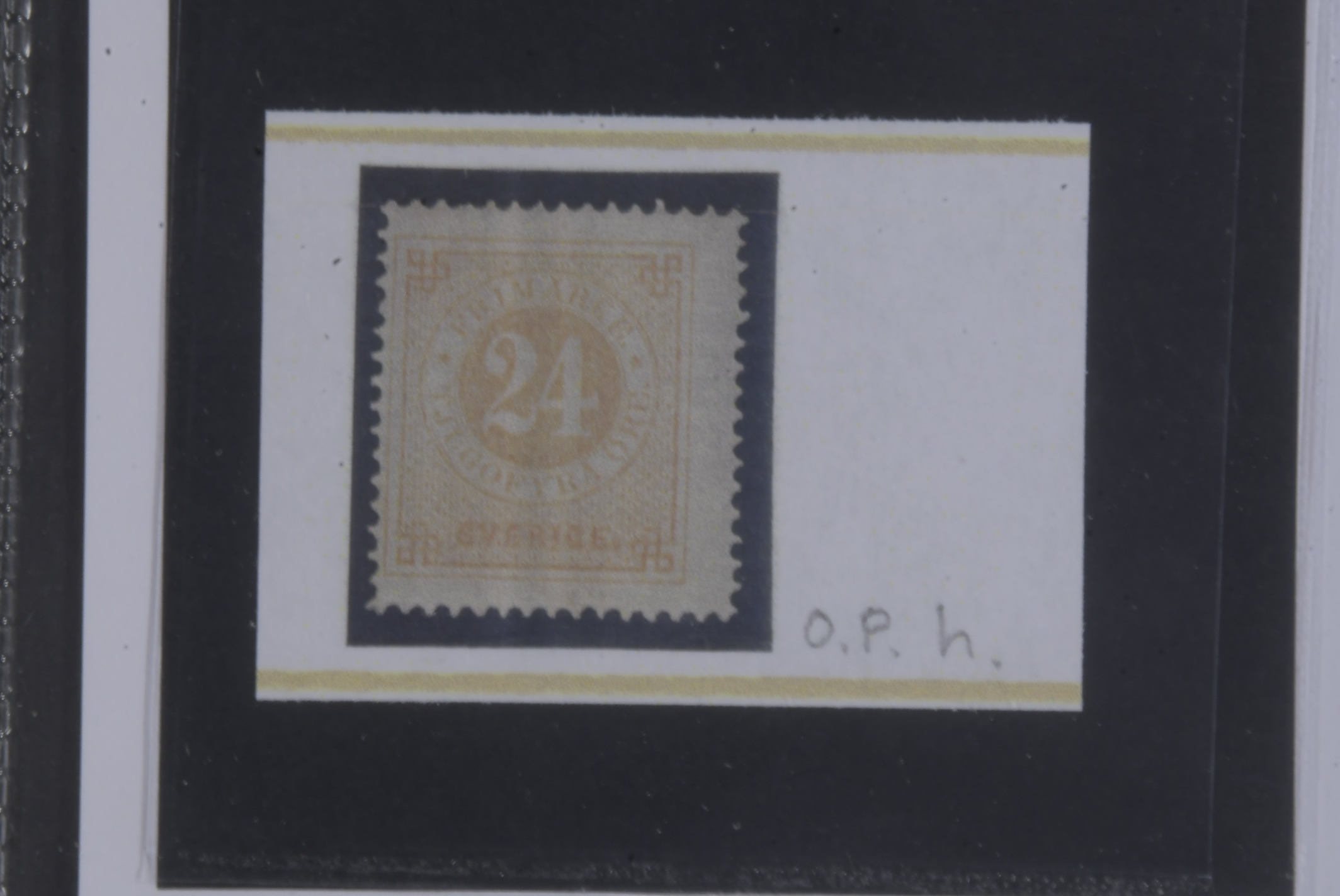 Sweden. Facit 24h ★, 24 öre dull yellow-yellow. One weakly bent corner perf. and one somewhat short perf. Owner mark on reverse. Opinion (shade) by O.P. SEK 10000