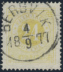 Sweden. Facit 24i used, 24 öre lemon-yellow. Very beautiful example cancelled BERGVIK 4.9.1877. Scarce shade.