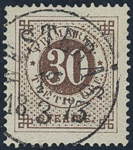 Sweden. Facit 25b used, 30 öre reddish brown on ordinary paper. Very beautiful example example of this scarce shade. Cancelled WESTERÅS 17.3.1873. Slightly short perf. Signed by O.P.