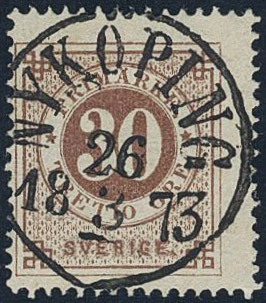 Sweden. Facit 25c used, 30 öre red-brown on yellowish paper. EXCELLENT cancellation NYKÖPING 26.3.1873. Signed by O.P.