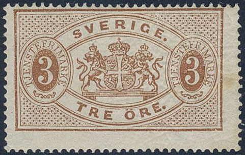 Sweden. Official Facit Tj1 ★★, 3 öre brown, perf 14. Small rust stain. Opinion (shade) by O.P. SEK 1900