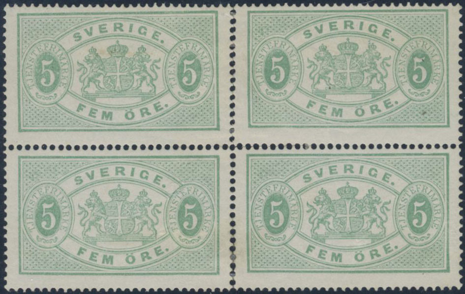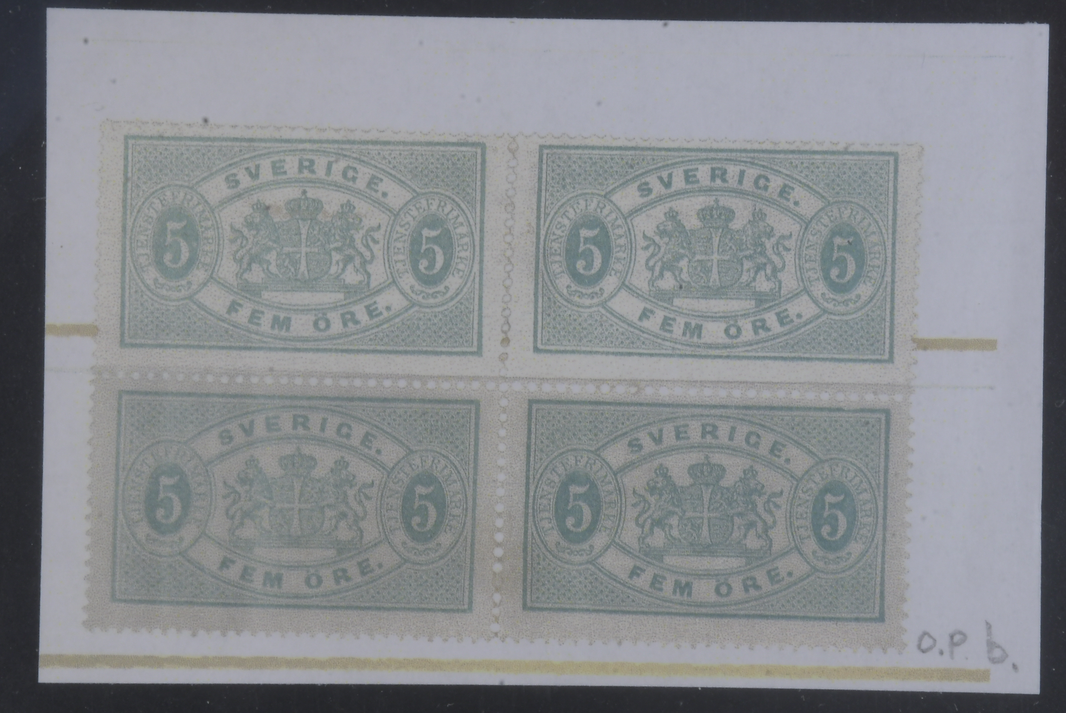 Sweden. Official Facit Tj3b ★, 5 öre light blue-green, perf 14. Block of four. Opinion (shade) by O.P. SEK 5500