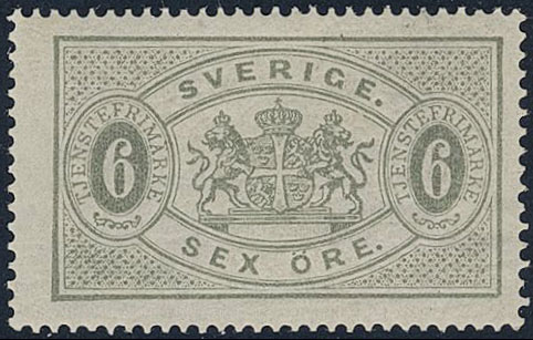 Sweden. Official Facit Tj4c ★, 6 öre olivish grey, perf 14. Weakly bent corner perf. Opinion (shade) by O.P. SEK 4200