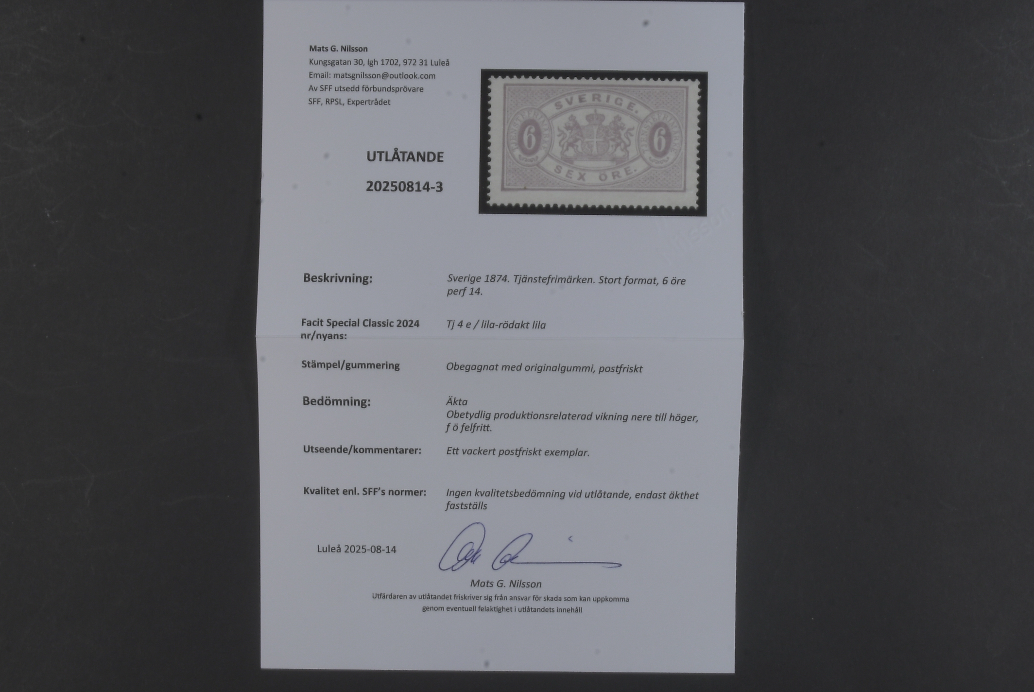 Sweden. Official Facit Tj4e ★★, 6 öre lilac, perf 14. Weak natural crease. Opinion Mats Nilsson (2025). SEK 5500
