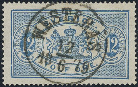 Sweden. Official Facit Tj5 used, 12 öre blue, perf 14. EXCELLENT cancellation 12.6.1879.