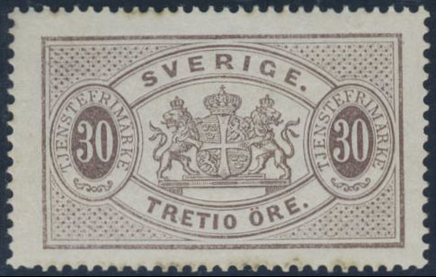 Sweden. Official Facit Tj8a ★, 30 öre deep brown, perf 14, blue-greyish paper. Opinion (shade) by O.P. SEK 3400