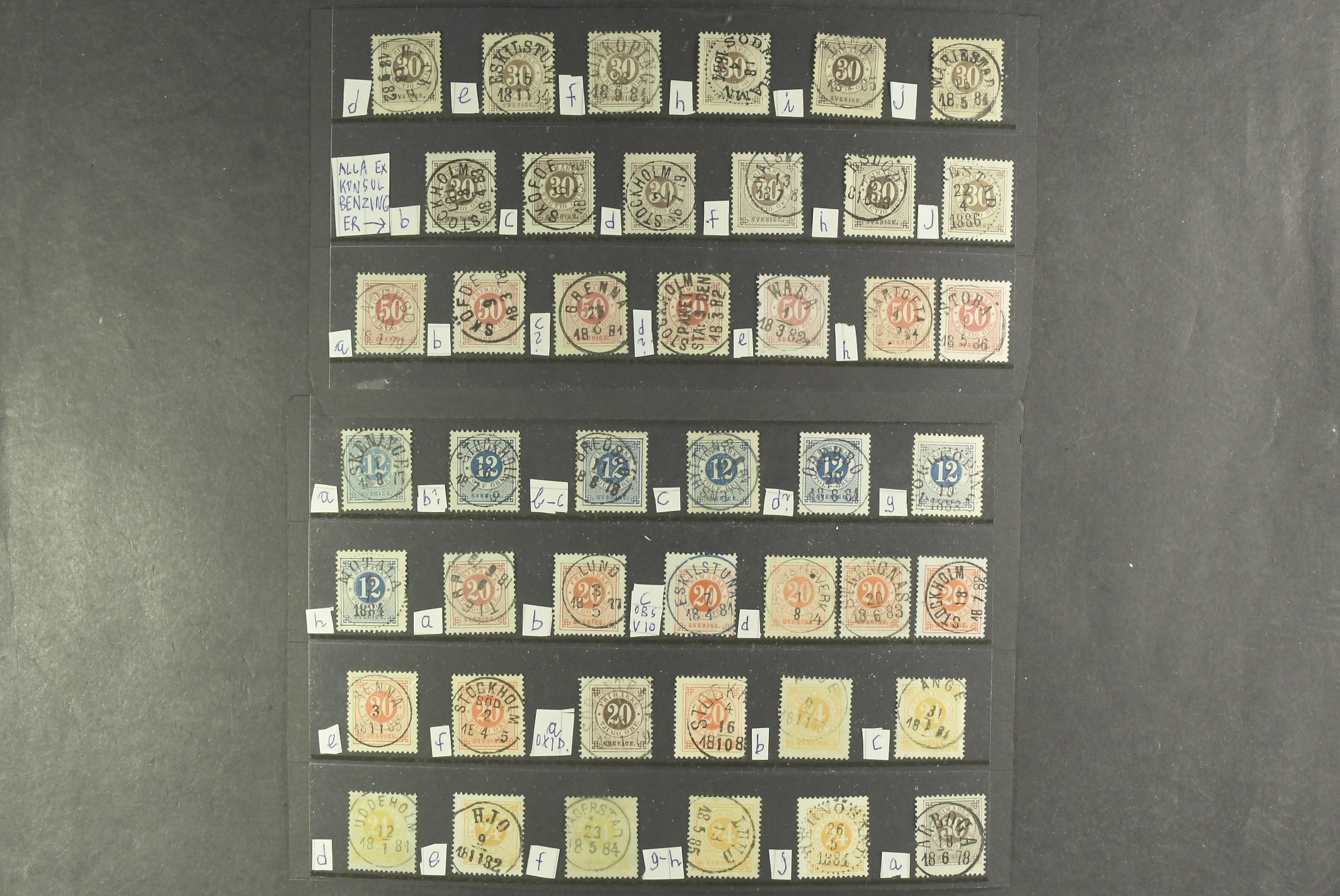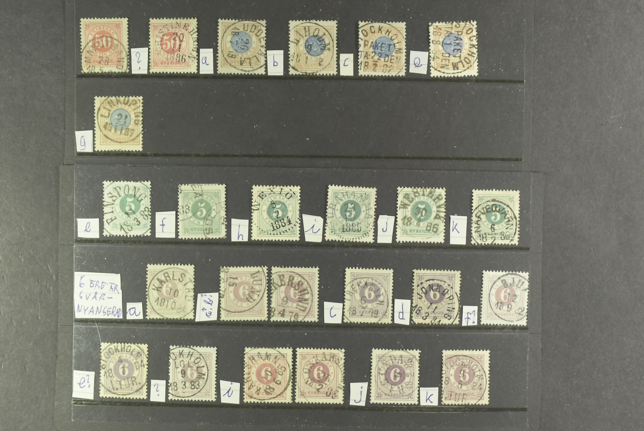 Sweden. Facit 28–36, 38 used, SET without 1 Rd (10). 91 stamps classified in shades by the vendor, many with excellent canc.