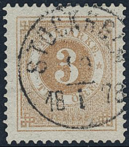 Sweden. Facit 28b used, 3 öre dull orange-brown. Superb cancellation STOCKHOLM 10.1.1878.
