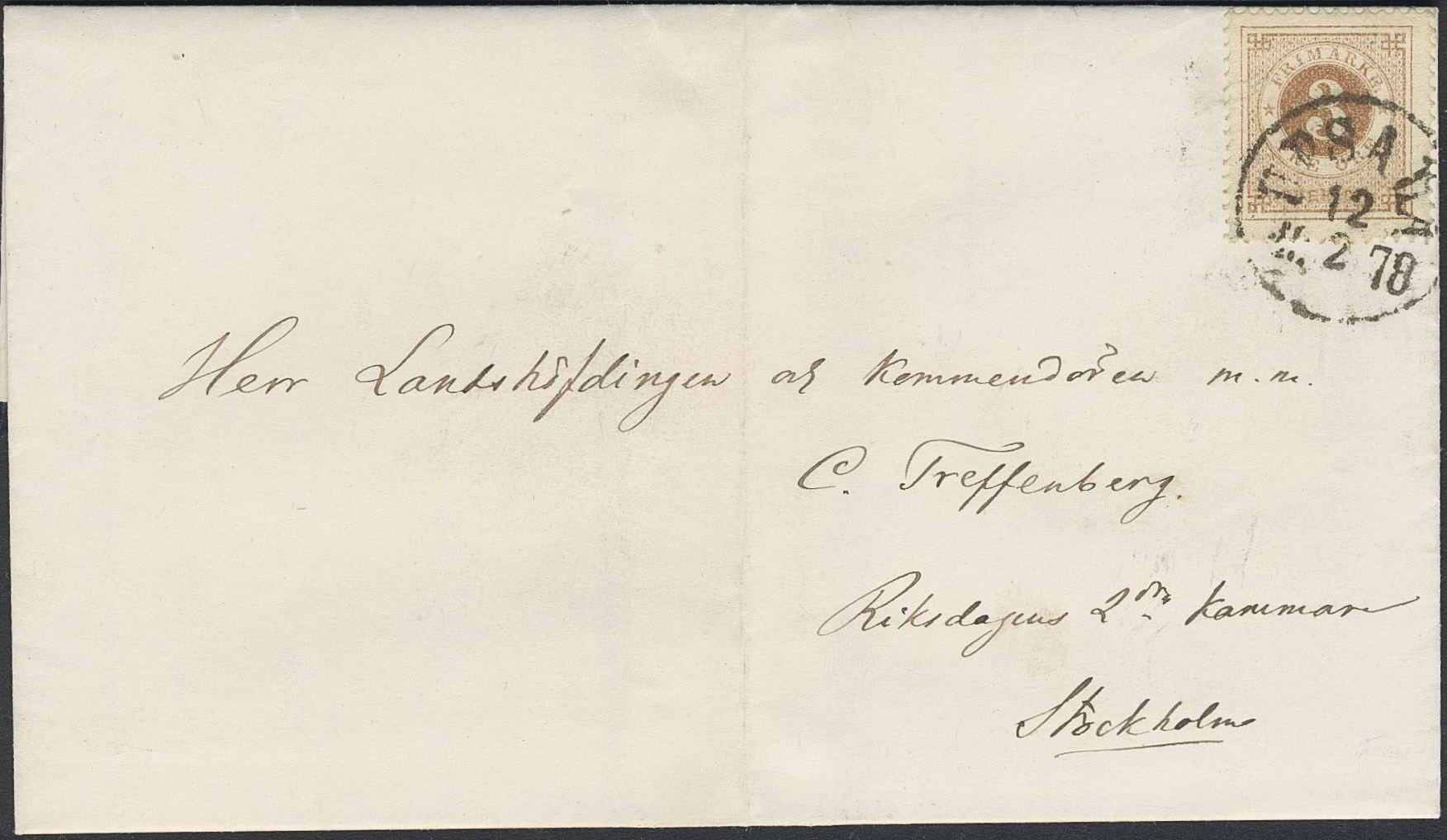 Sweden. Facit 28c on cover, 3 öre dark orange-brown on printed matter sent from UPSALA 12.2.1878 to Stockholm. Scarce shade on cover. SEK 2500