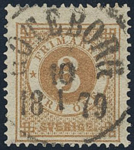 Sweden. Facit 28d used, 3 öre yellow-brown. EXCELLENT cancellation GÖTEBORG 10.1.1879. Small owner mark on the reverse. Signed by O.P.