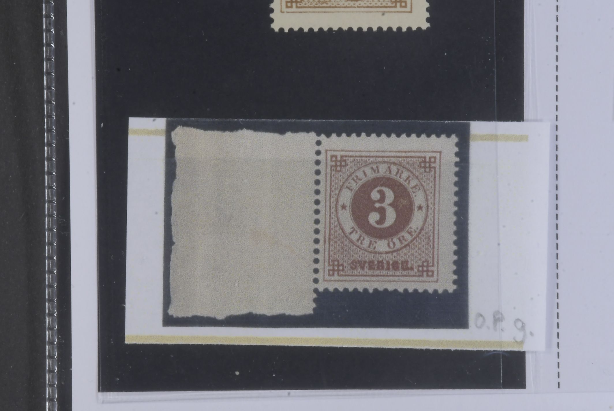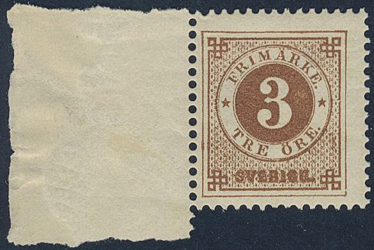 Sweden. Facit 28g ★★, 3 öre deep orange-brown, calendered paper. MNH with sheet margin at left. Opinion (shade) by O.P. SEK 3600