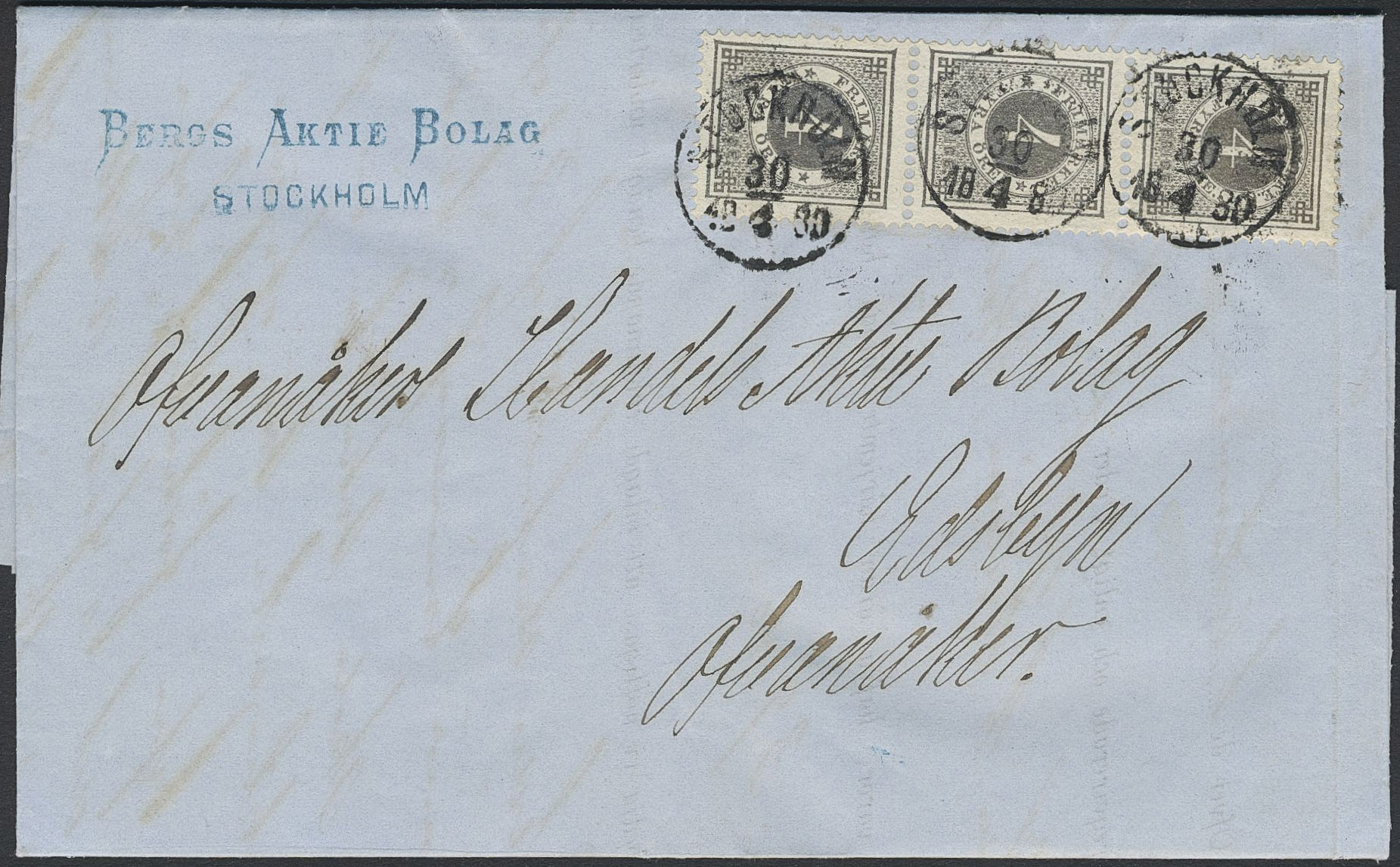 Sweden. Facit 29 on cover, 3×4 öre in STRIP OF THREE on cover sent from STOCKHOLM 30.4.1880 to Ovanåker.