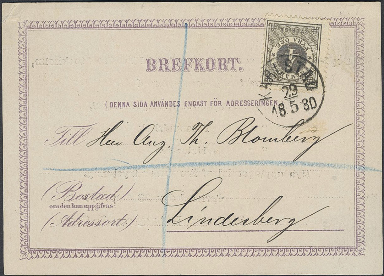 Sweden. Facit 29 on cover, 4 öre on early privately printed postcard, sent as printed matter from KARLSTAD 29.5.1880 to Lindesberg. Decorative item.
