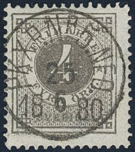 Sweden. Facit 29a1 used, 4 öre dark grey. EXCELLENT cancellation PKXP Nr 5 NED 25.6.1880.