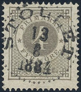 Sweden. Facit 29d used, 4 öre deep grey-grey. EXCELLENT cancellation STÖLLET 13.8.1884. Very weak ink lines on the reverse.