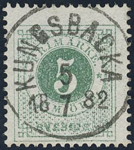 Sweden. Facit 30d used, 5 öre clear green. EXCELLENT cancellation KUNGSBACKA 5.7.1882.