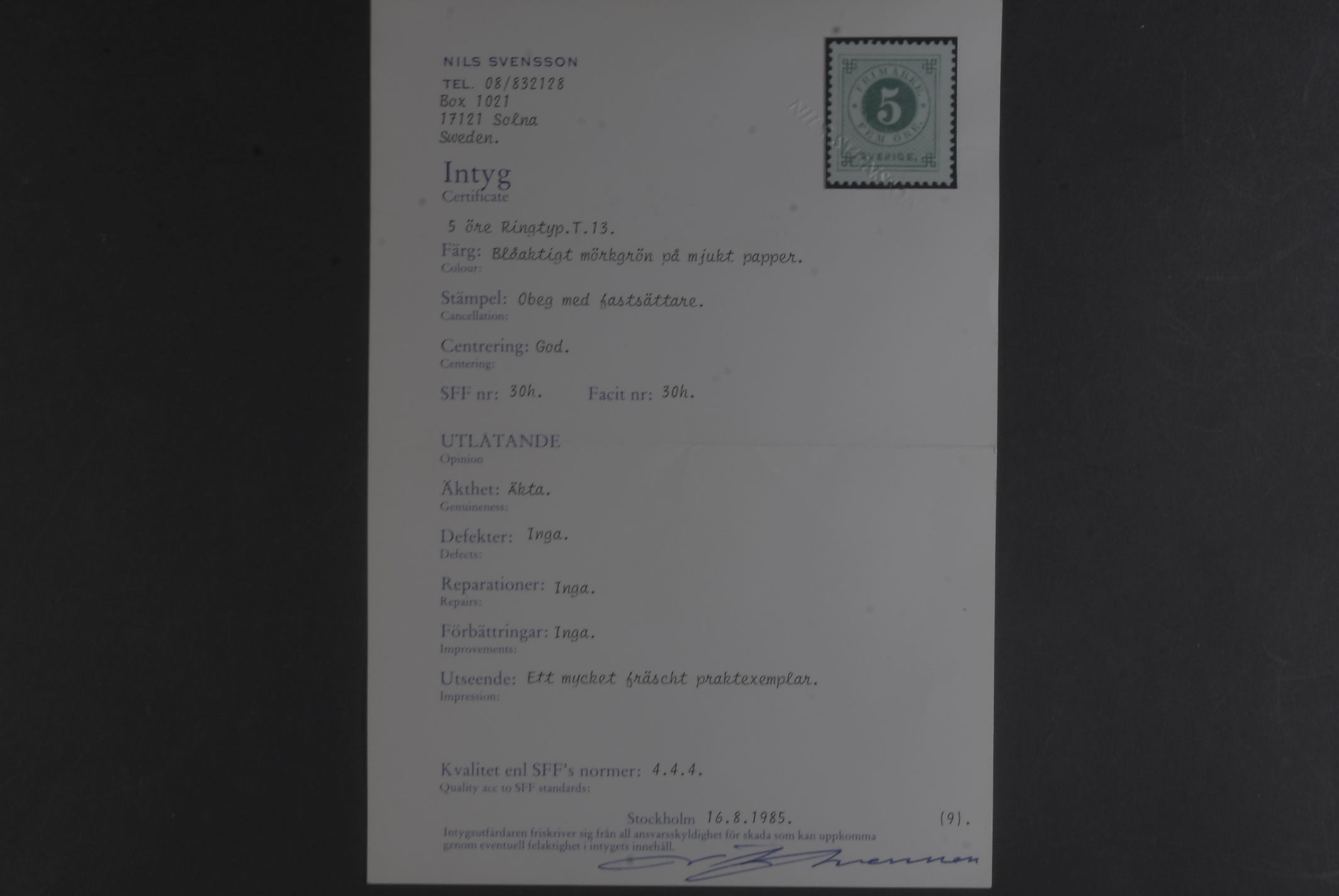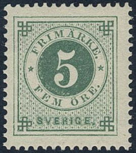 Sweden. Facit 30h ★, 5 öre bluish dark-green on soft paper. Superb. Certificate Nils Svensson 4.4.4 (1985).