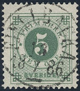 Sweden. Facit 30k used, 5 öre dark green. EXCELLENT cancellation FJELLBACKA 13.7.1886.