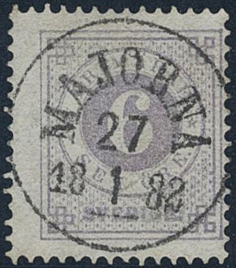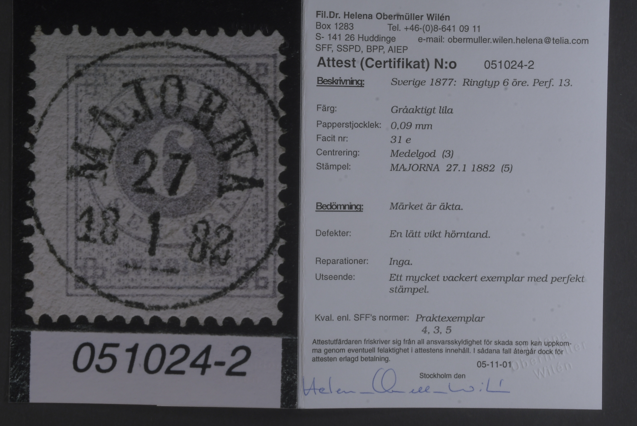 Sweden. Facit 31e used, 6 öre greyish lilac. EXCELLENT cancellation MAJORNA 27.1.1882. One weakly bent corner perf. Certificate HOW 4, 3, 5 (2005).
