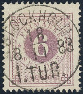 Sweden. Facit 31i used, 6 öre red-lilac on soft paper. EXCELLENT cancellation STOCKHOLM 1.TUR 18.11.1883.