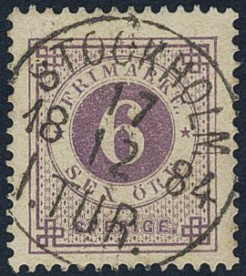 Sweden. Facit 31k used, 6 öre red-lilac on calendered paper. Superb cancellation STOCKHOLM 1.TUR 17.12.1884.