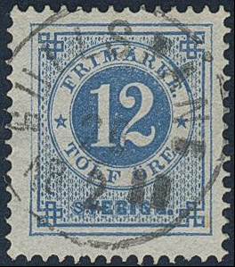 Sweden. Facit 32b used, 12 öre deep blue. EXCELLENT cancellation GULLSPÅNG 26.2.1880.