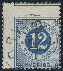 Sweden. Facit 32v6 used, 12 öre blue, extremely displaced perf. Parts of four stamps. Cancelled BROBY 1883.