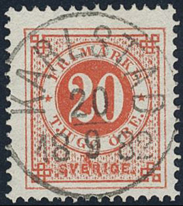 Sweden. Facit 33d used, 20 öre dull orange-red. EXCELLENT cancellation KARLSTAD 20.9.1882.