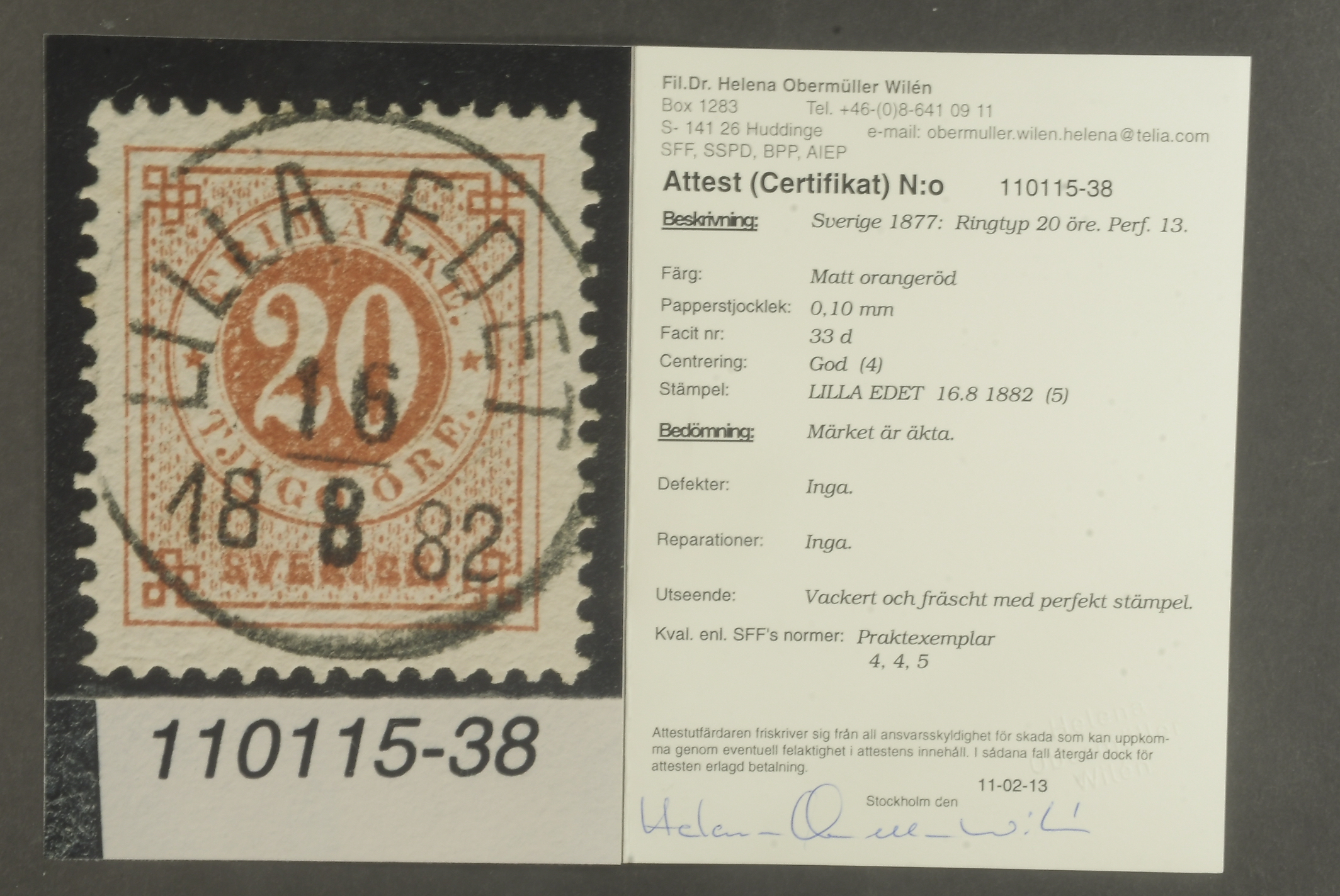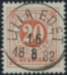 Sweden. Facit 33d used, 20 öre dull orange-red. Excellent canc. LILLA EDET 16.8.1882. Cert. HOW 'Vackert och fräscht med perfekt stämpel', 4.4.5. SEK 10