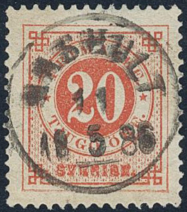 Sweden. Facit 33f used, 20 öre orange-red on calendered paper. EXCELLENT cancellation NÄSHULT 11.5.1886.