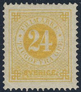Sweden. Facit 34c ★, 24 öre orange-yellow. Very fine–superb. Signed by O.P. SEK 2000+