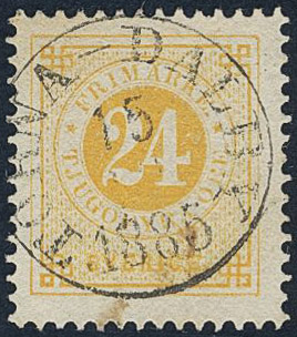 Sweden. Facit 34h used, 24 öre orange-yellow. Superb cancellation TORNA-DALBY 15.1x.1885.