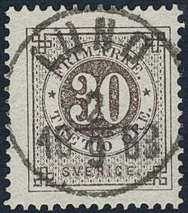 Sweden. Facit 35b2 used, 30 öre black-brown on hard white paper. EXCELLENT cancellation LUND 2.9.1883.