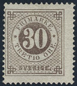 Sweden. Facit 35f ★, 30 öre dull brown with thick numerals. Opinion (shade) by O.P. SEK 7000