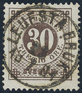 Sweden. Facit 35f used, 30 öre dull brown with thick numerals. Superb cancellation LEUFSTA BRUK 23.7.1884. Slightly short perf.