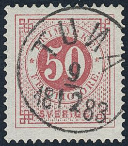 Sweden. Facit 36d used, 50 öre dull violetish carmine. Superb cancellation TUNA 9.12.1883 with the letter N mirrored.