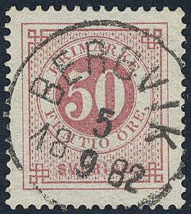 Sweden. Facit 36e used, 50 öre rose. Superb cancellation BERGVIK 5.9.1882.