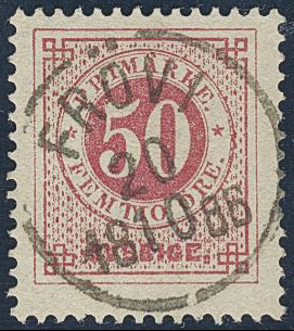 Sweden. Facit 36h used, 50 öre carmine-rose on calendered paper. Superb cancellation FRÖVI 20.10.1885. Signed by O.P.