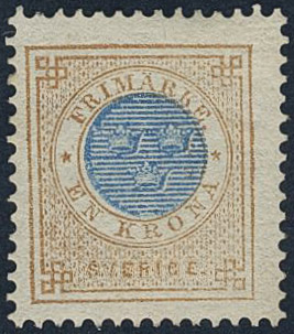 Sweden. Facit 38a ★, 1 Krona orange-brown/blue. One somewhat short perf. Small owner mark on the reverse. SEK 6000