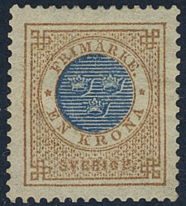 Sweden. Facit 38b ★, 1 Krona yellow-brown/dark blue. Very fine example. Certificate HOW 3,4,3 (2012). SEK 8000
