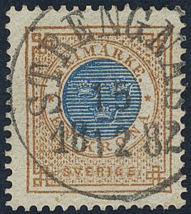 Sweden. Facit 38c used, 1 Krona orange-brown/blue. Superb cancellation STRENGNÄS 15.12.1882.