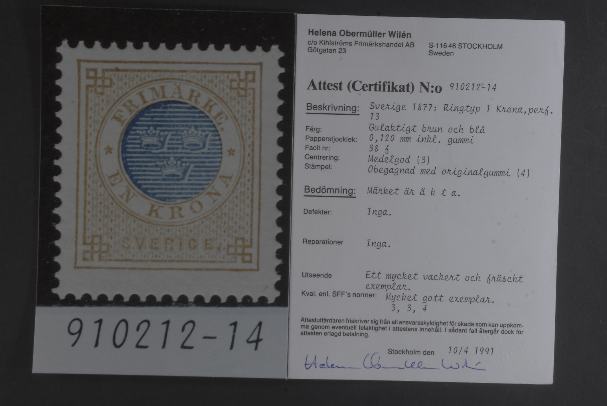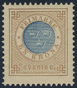 Sweden. Facit 38f ★, 1 Krona yellow-brown/blue on soft paper. Very fine example. Certificate HOW 3, 3, 4 (1991). SEK 8000
