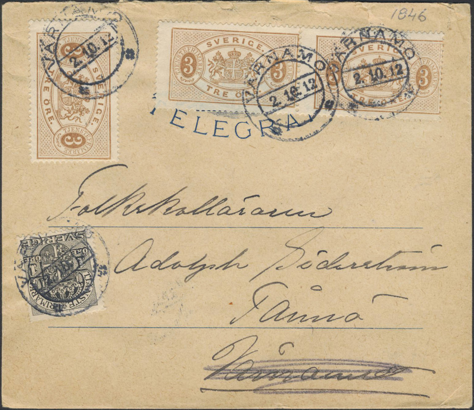 Sweden. Official Facit Tj12, 27 on cover, 1+3×3 öre as scarce combination on telegram cover sent from VÄRNAMO 2.10.12 to Tånnä.