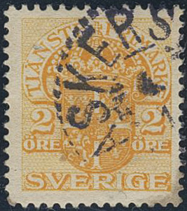 Sweden. Official Facit Tj28vm used, 2 öre yellow with INVERTED wmk crown (some brownish perf), corner perf faults. SEK 10000