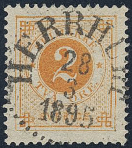 Sweden. Facit 40a used, 2 öre yellowish orange. EXCELLENT cancellation HERRHULT 28.3.1895. Signed by O.P.
