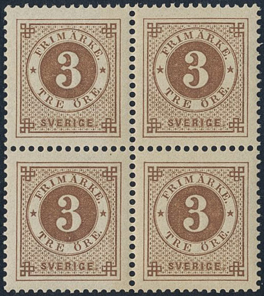 Sweden. Facit 41 used, 3 öre brown in block of four. Superb–EXCELLENT. SEK 2400+